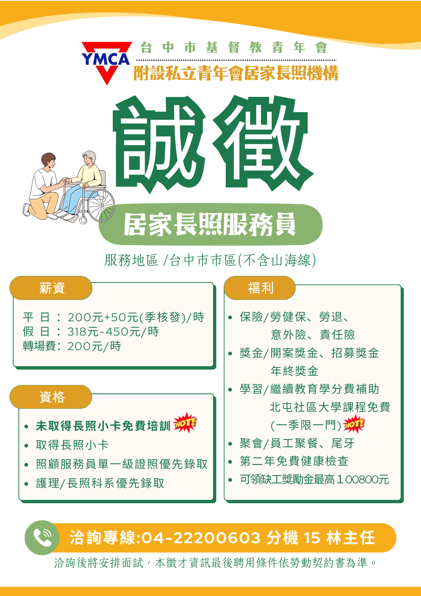 YMCA居家長照居服員招募中,無長照小卡、無經驗可免費培訓!